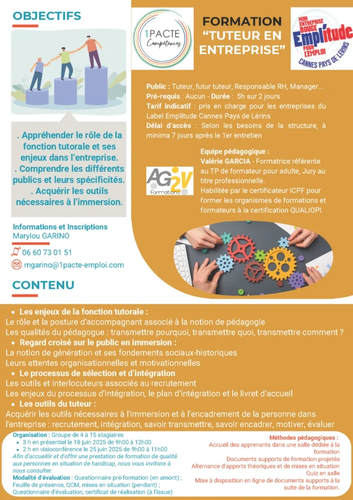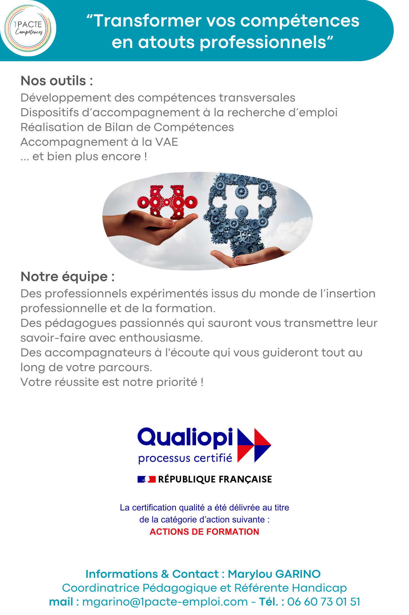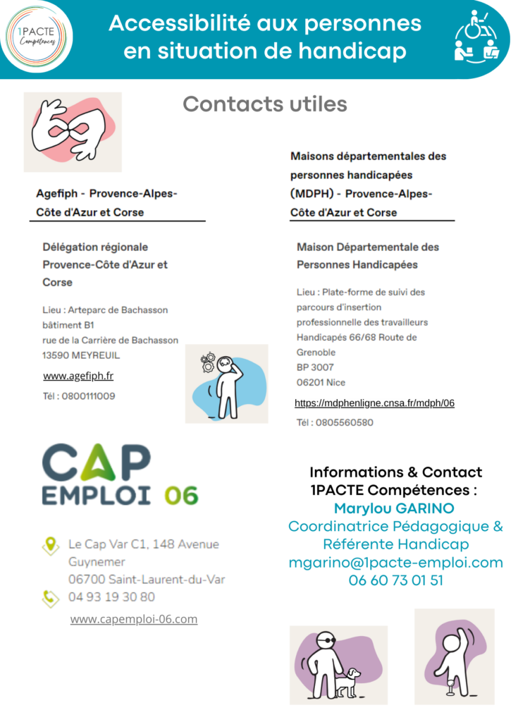 Marylou GARINO, Coordinatrice Pédagogique et Référente Handicap – 06 60 73 01 51, mgarino@1pacte-emploi.com